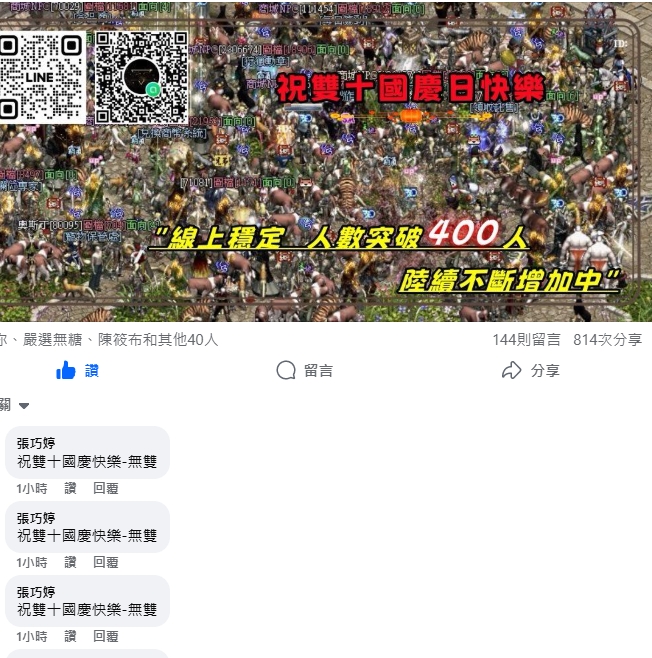 至天堂粉絲團置頂文章 留言 祝雙十國慶快樂-遊戲ID(10次)